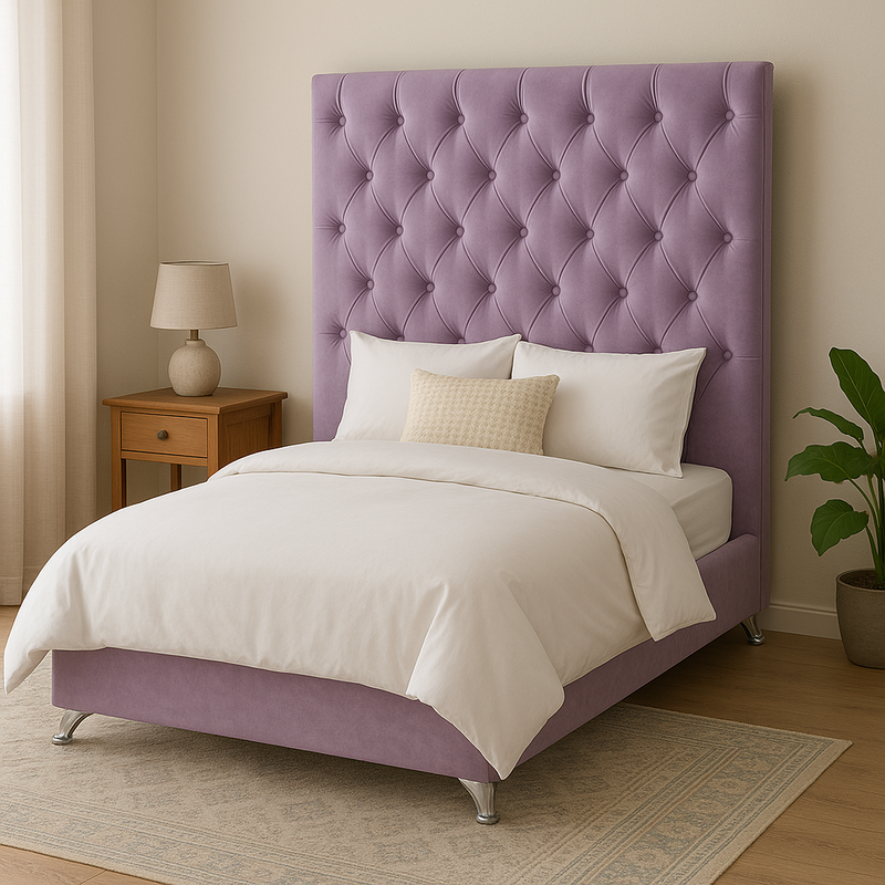 A pastel lavender headboard paired with grey walls and minimal décor strikes a balance between elegance and calmness.